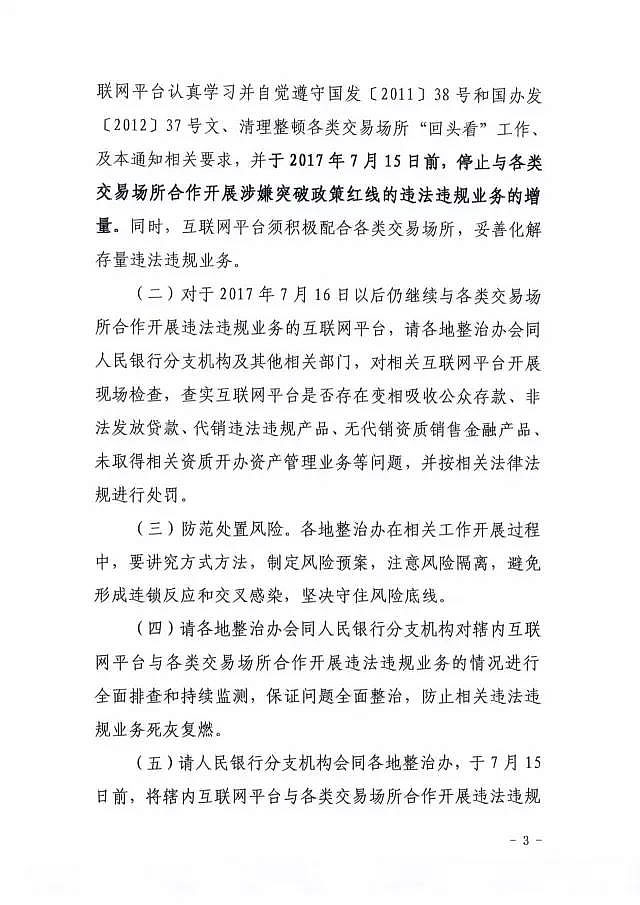 關于對互聯網平臺與各類交易場所合作從事違法違規業務開展清理整頓的通知